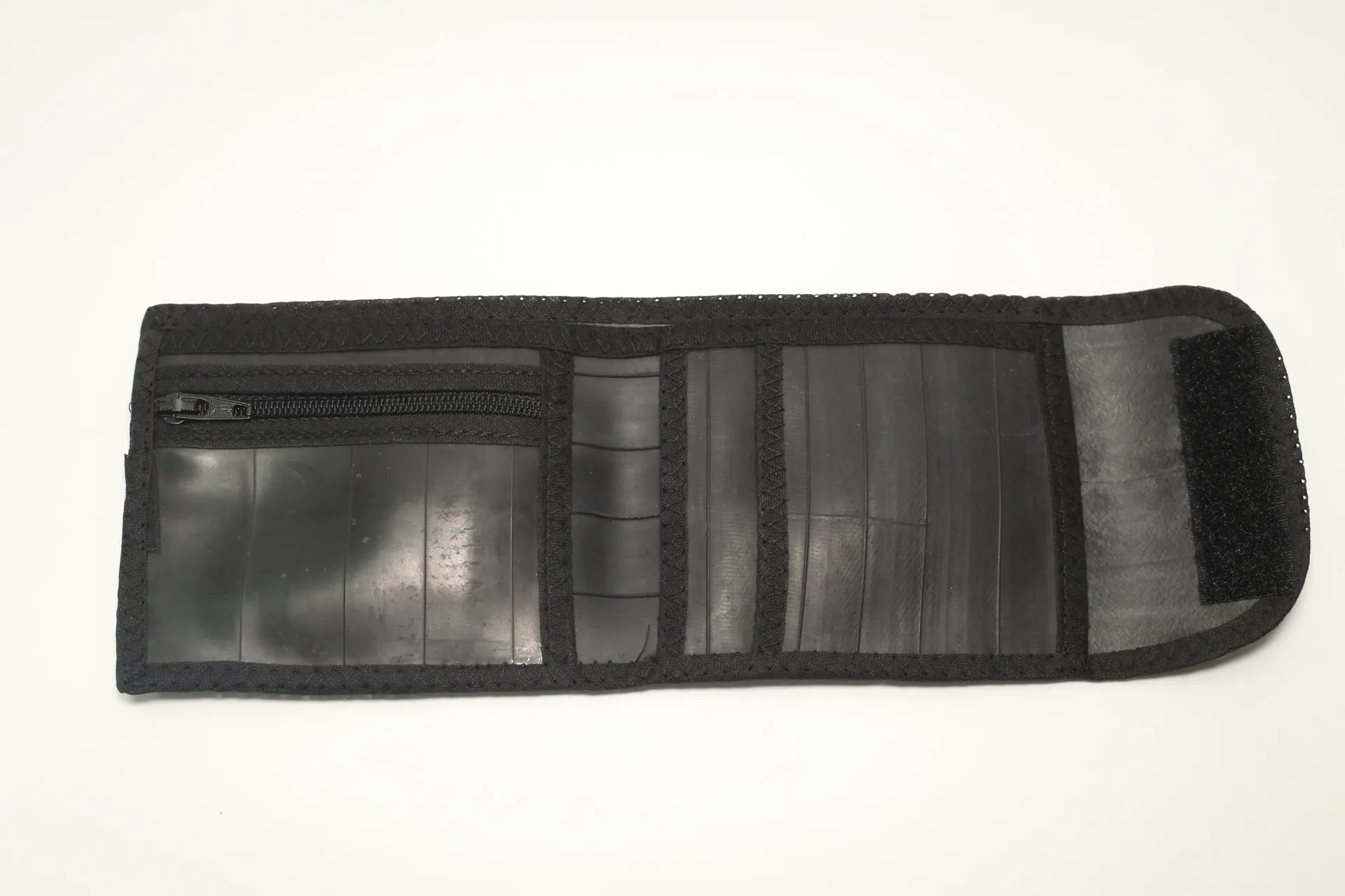 A bi-fold wallet made from recycled bicycle inner tubes which closes with a Velcro flap. It is edged with cotton binding.