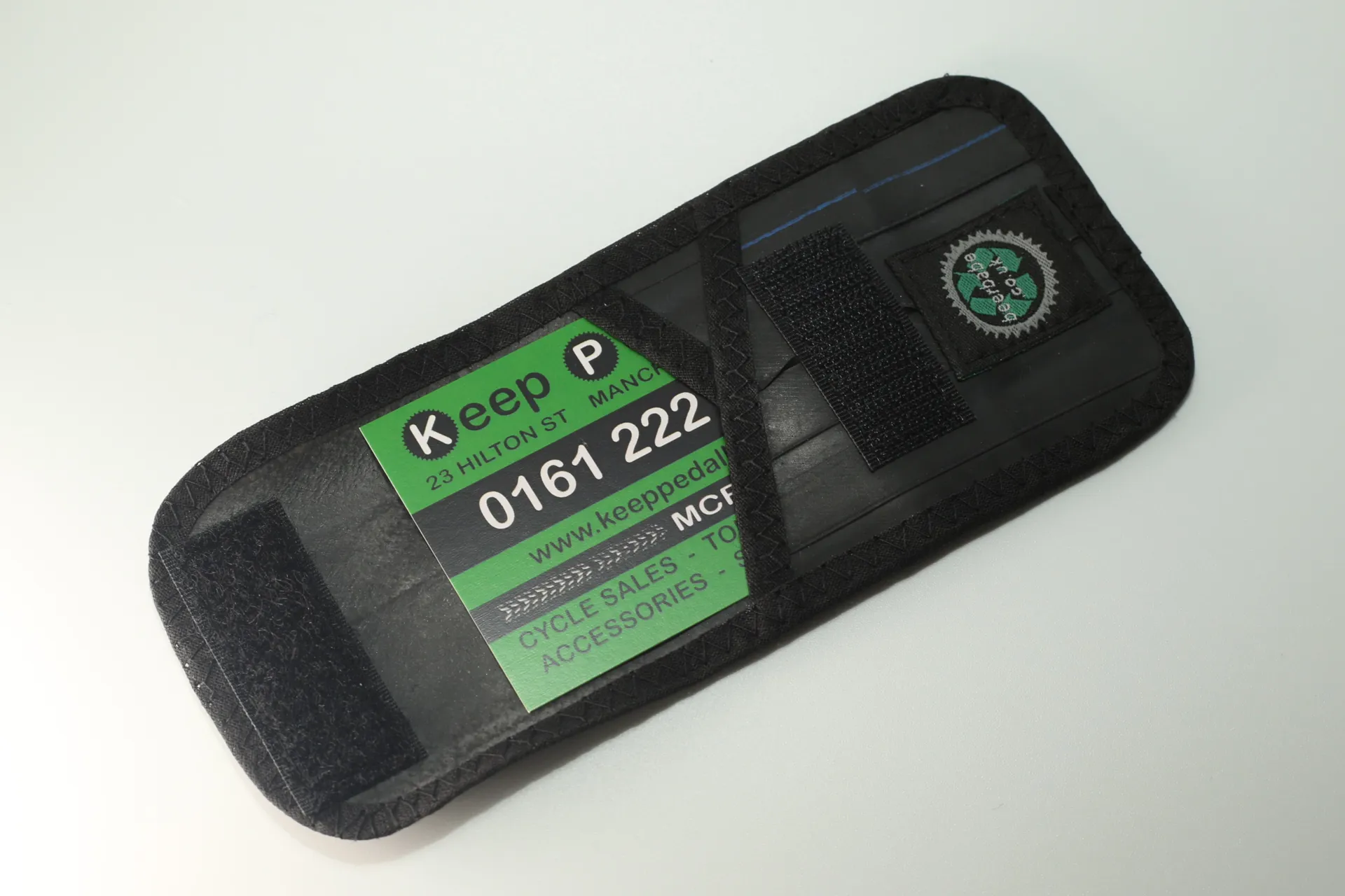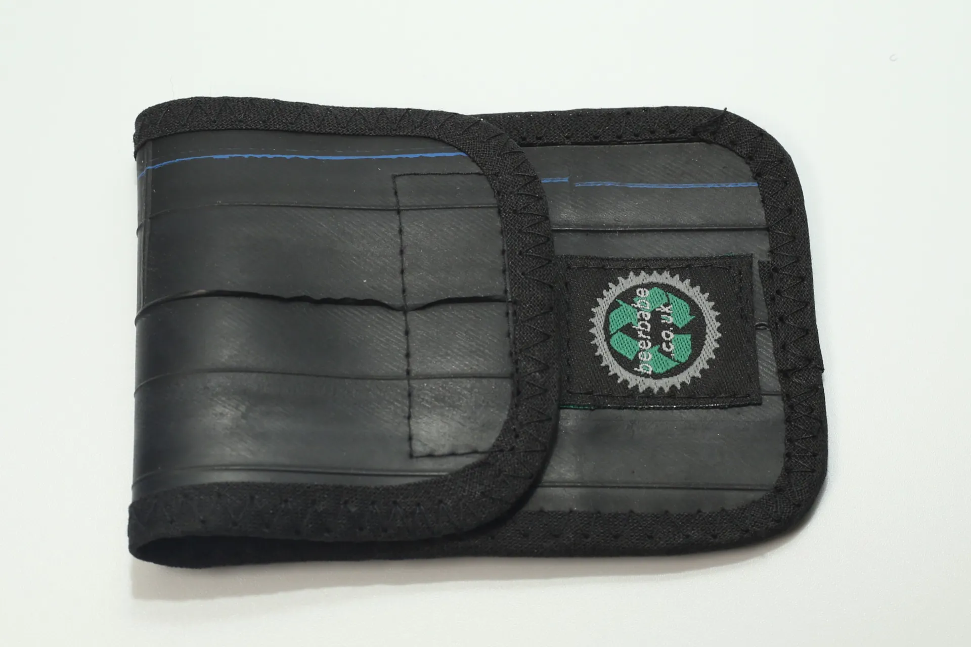 A simple wallet made from recycled bicycle inner tubes which closes with a Velcro flap. It is edged with cotton binding.