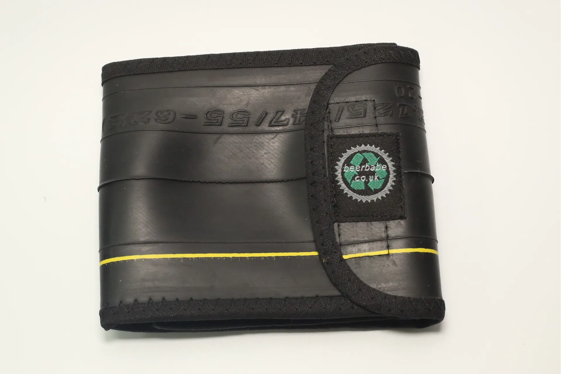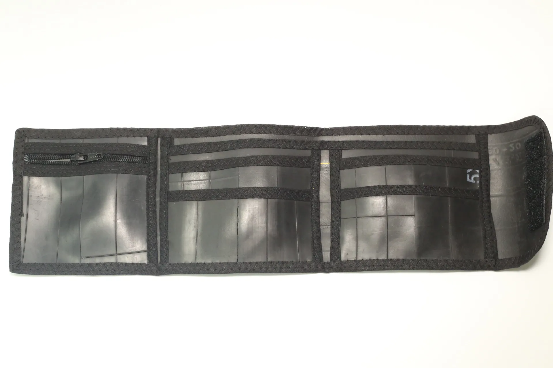 A tri-fold wallet made from recycled bicycle inner tubes which closes with a Velcro flap. It is edged with cotton binding.