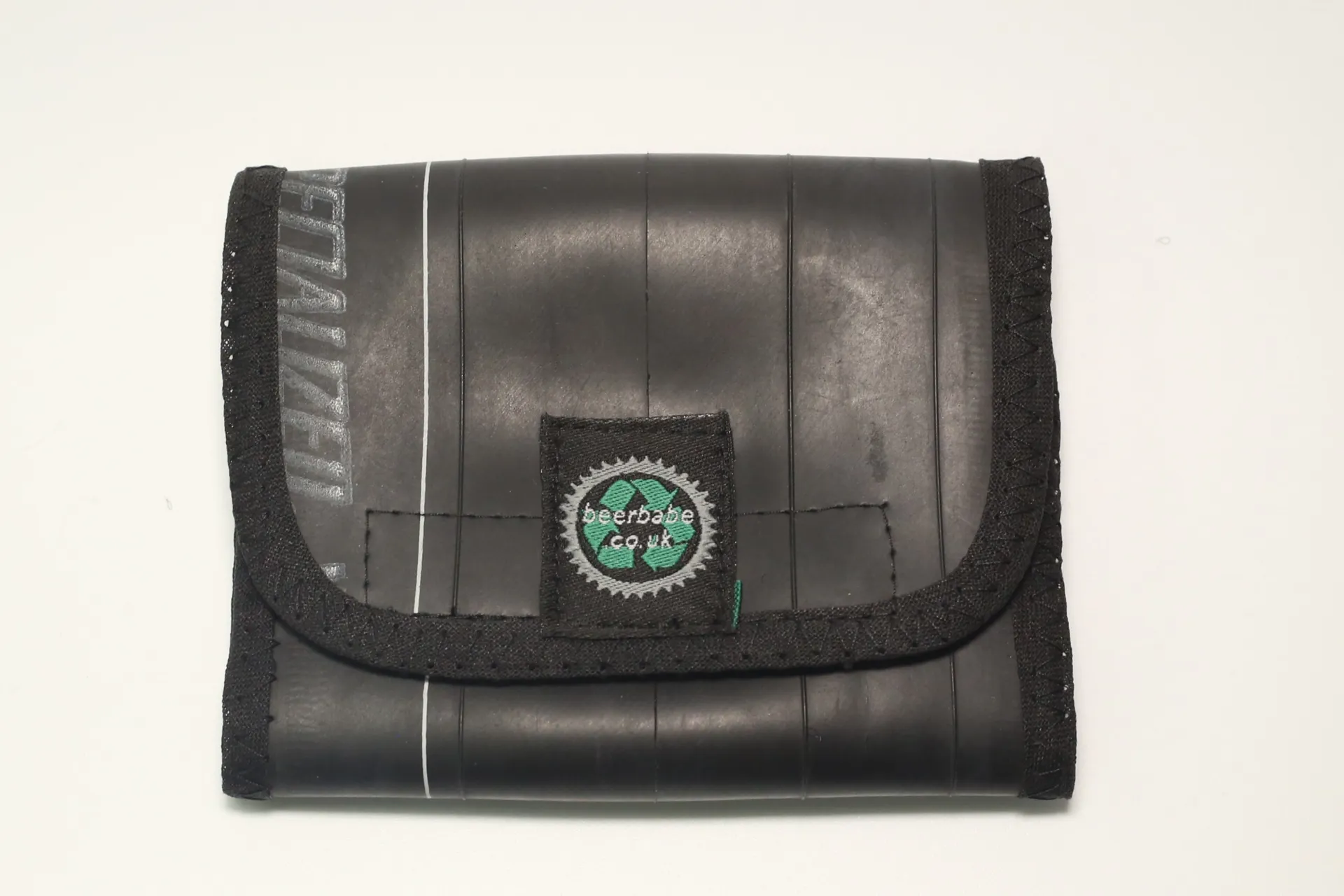 A compact tri-fold wallet made from recycled bicycle inner tubes which closes with a Velcro flap. It is edged with cotton binding.