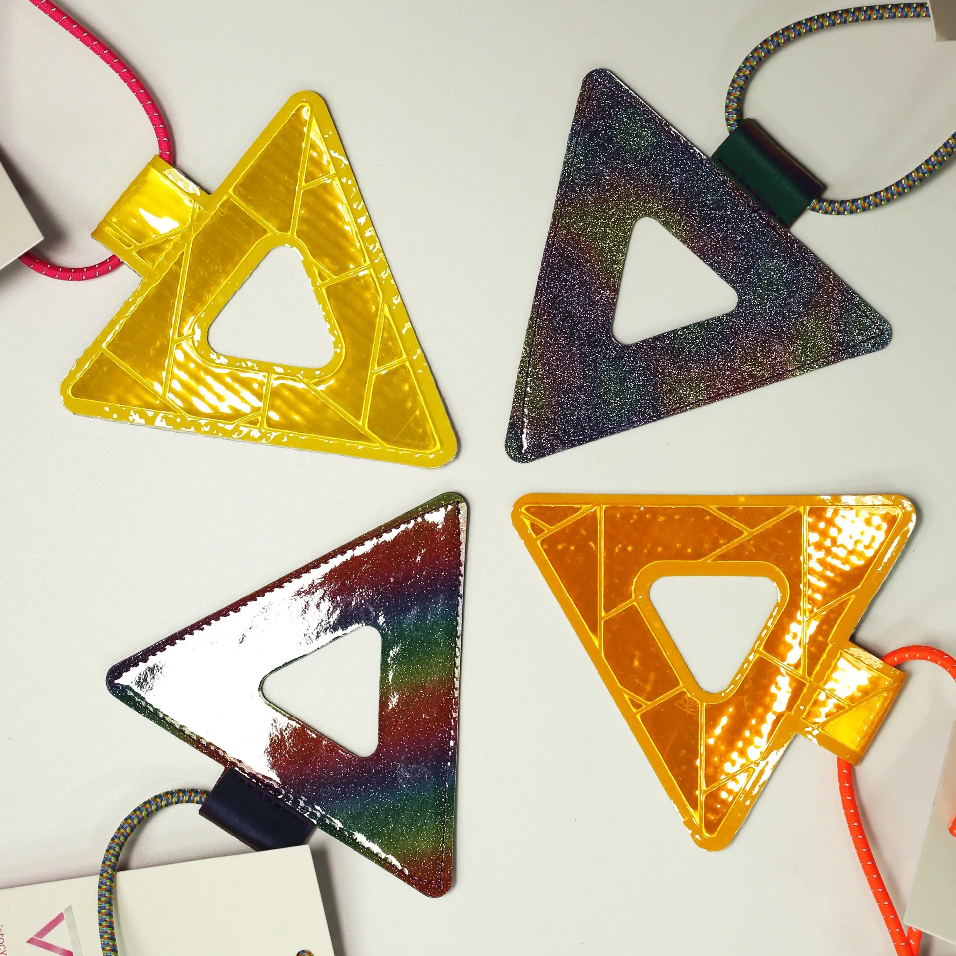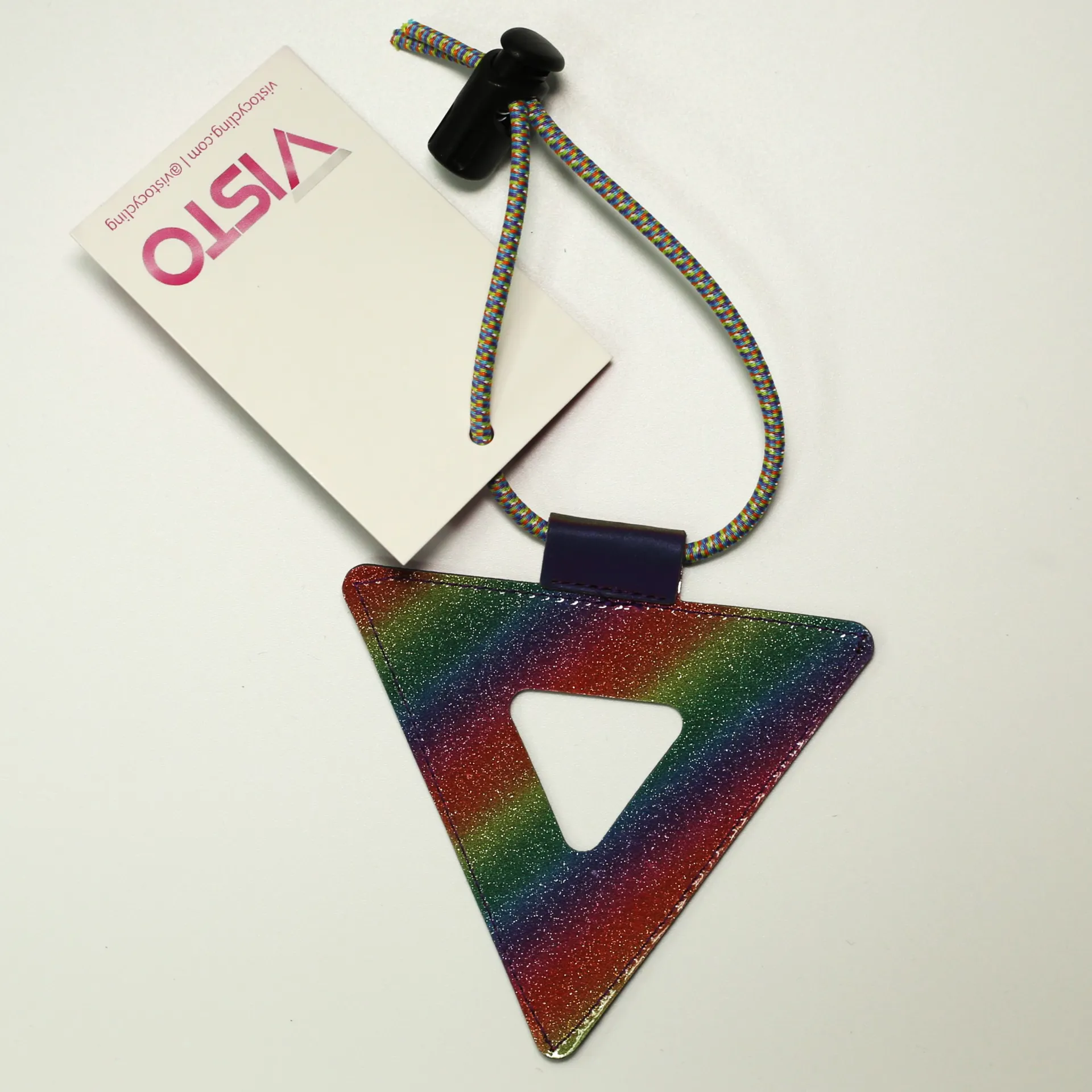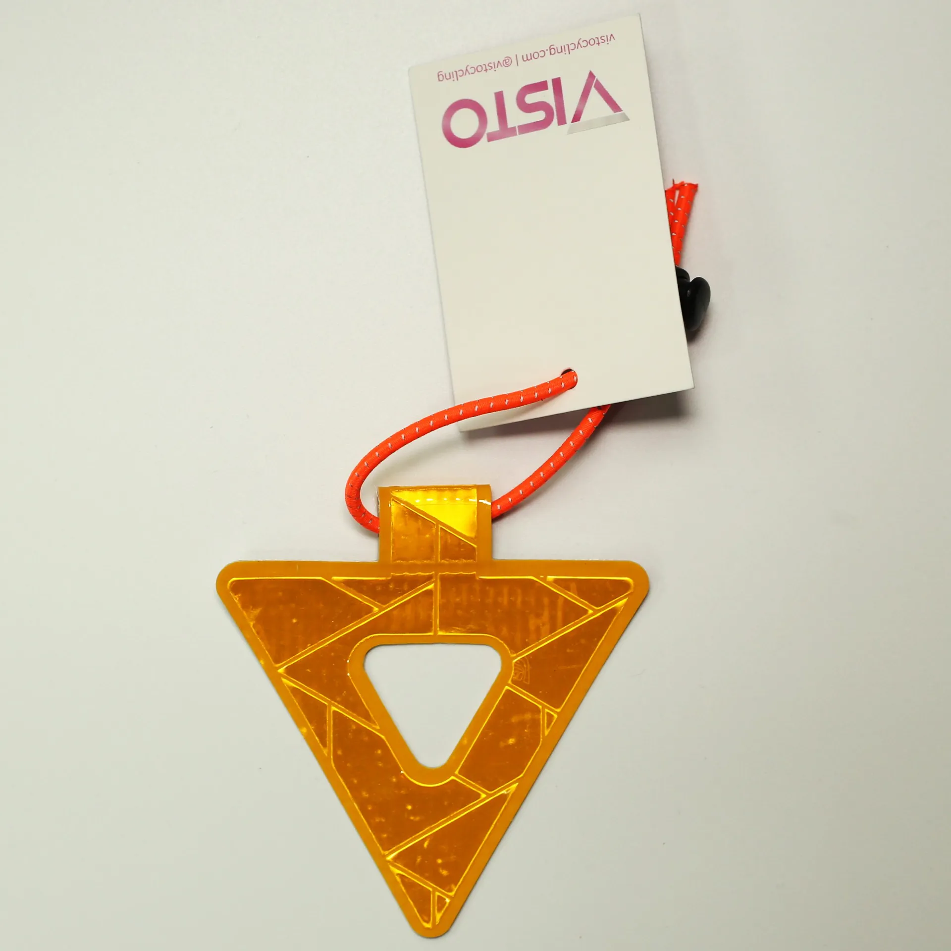 This is the V2 Prismatic Welded Visto. It is an extremely reflective and vibrantly visible safety triangle made with prismatic PVC on a rubberized or reflective backing.
