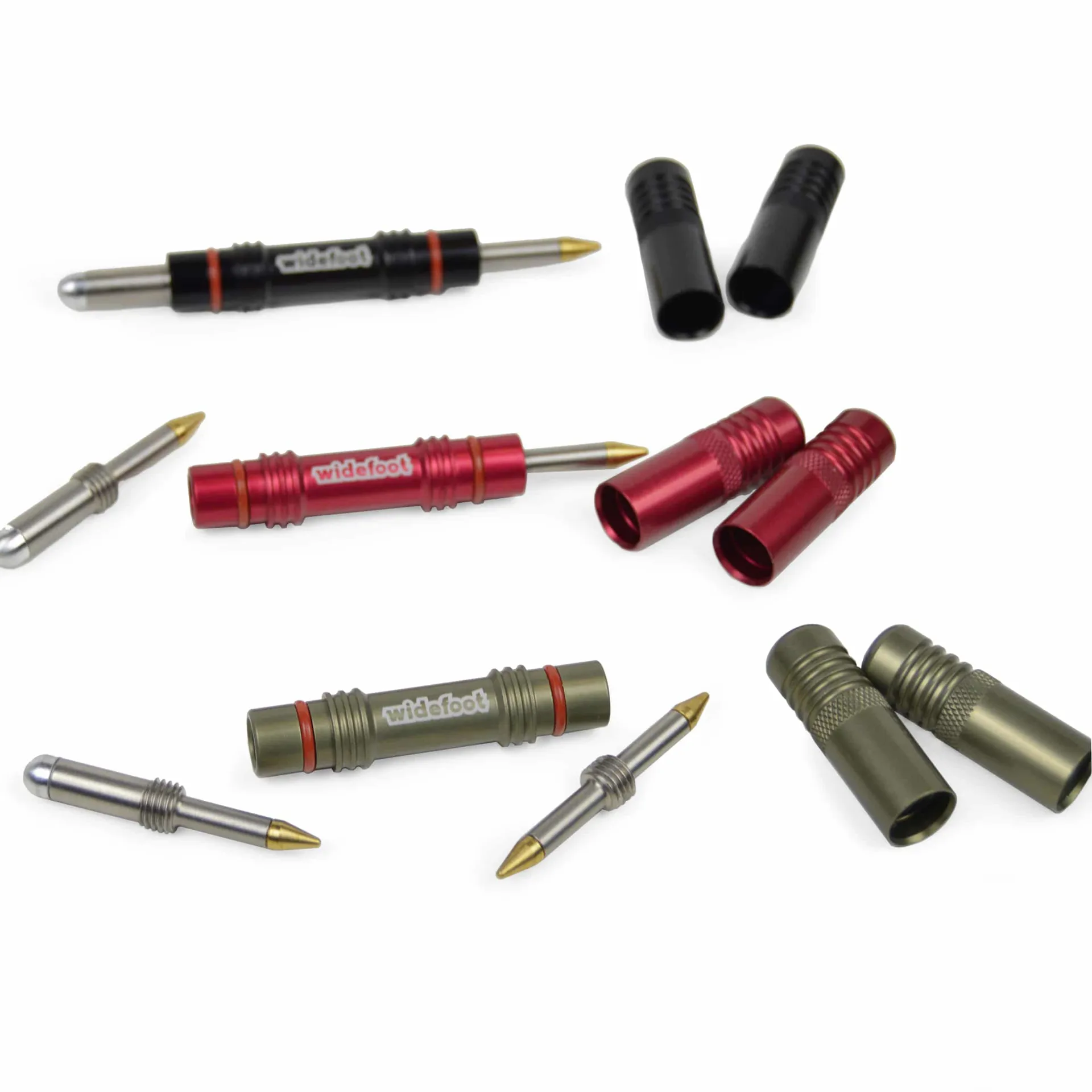 The fastest repair tool for tubeless bicycle tires. Plugs holes in tires that are too big for sealant alone. Machined from solid billet 6061 aluminum, anodized, and etched with our Widefoot logotype. Available in three colors: Black, Purple, and Orange.