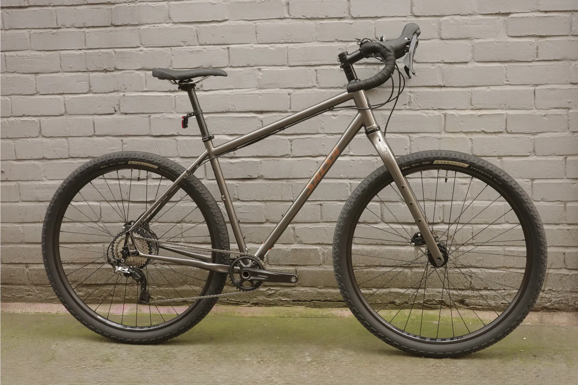 Here we have an example Keep Pedalling shop build with Shimano GRX600 drivetrain with WTB rims and Teravail tyres. Bike standard Cowchipper bars and a Shimano Deore chainset.