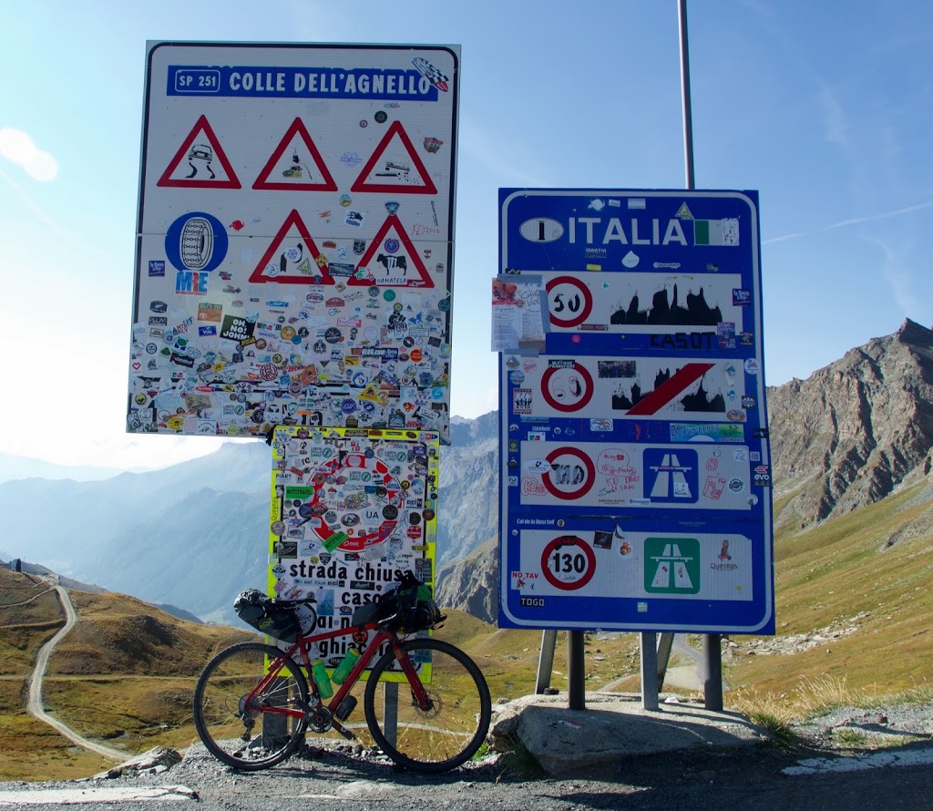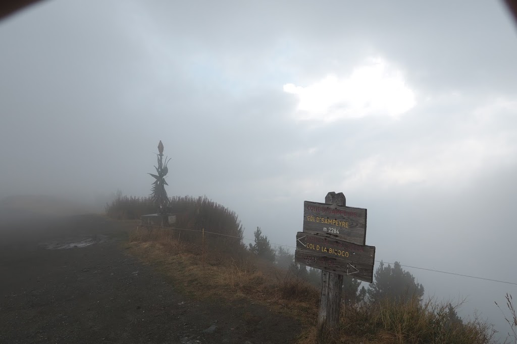 After a lunch of mozzarella and pomodorino paninis (sounds more exotic than cheese and tomato sandwiches) we felt almost human again and ready to take on another climb. The Colle di Sampeyre was another 1320m climb topping out at 2284m, as we climbed it became very ‘muggy’ and we soon realised the weather was about to break and we were in for a soaking. Half way up the mist rolled in, the tarmac stopped and the Colle suddenly became quite eerie, we plodded on (though maybe a little quicker now) till we reached the top and found a sign in the mist showing our way off the top.