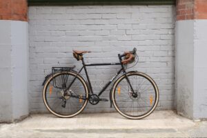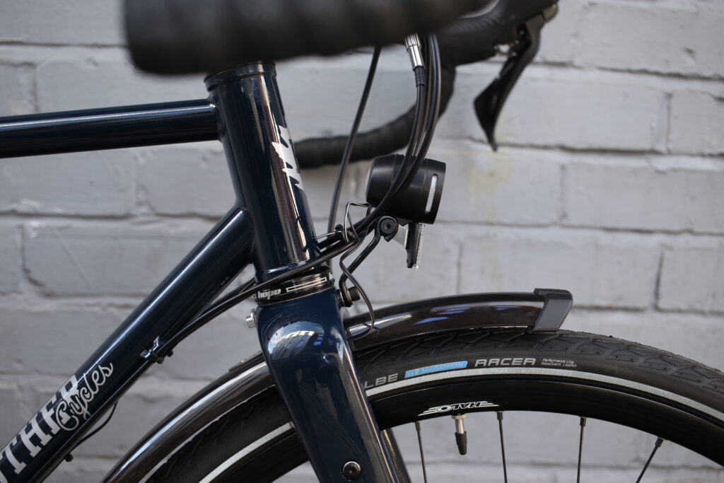 SP Dynamo on Halo vapour rims with a mix of Schwalbe Marathons for durability. Hope headset and bottom bracket for the long haul and King stainless cages to keep you hydrated on the way there.
