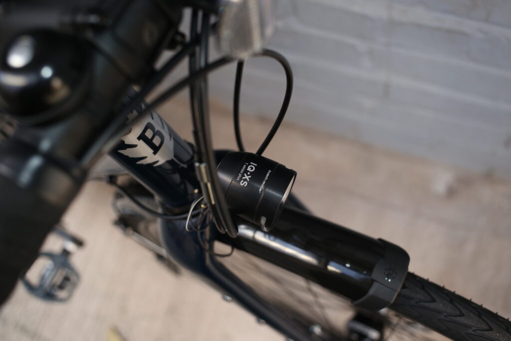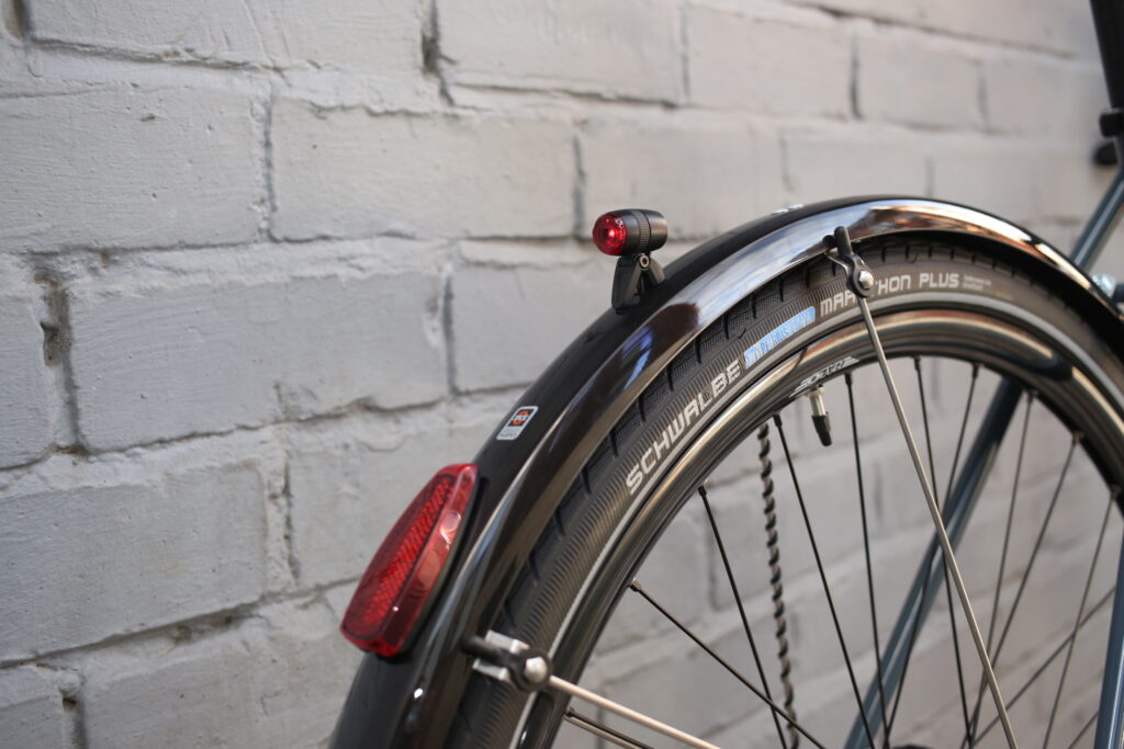 B&M IQ-xs front light provides perfectly adequate lighting and the mudguard mounted rear is oh so cute yet very bright. The smallest to conform to German regulations. We think a reasonable sized reflector is good with these lights.