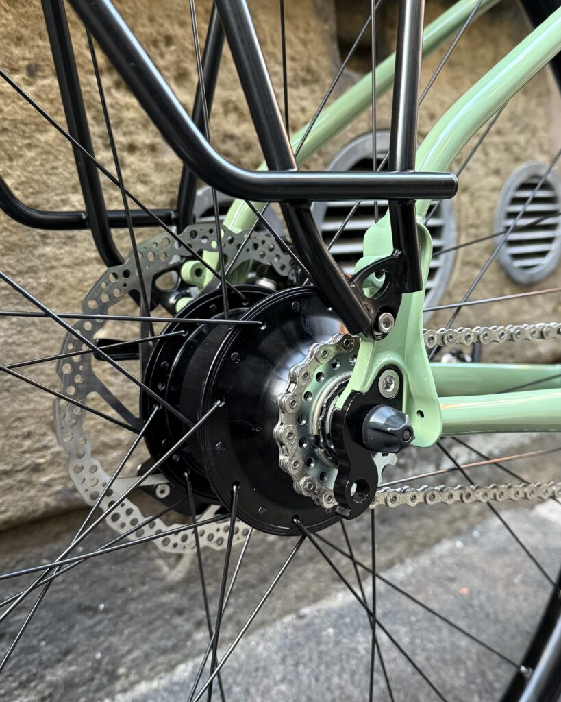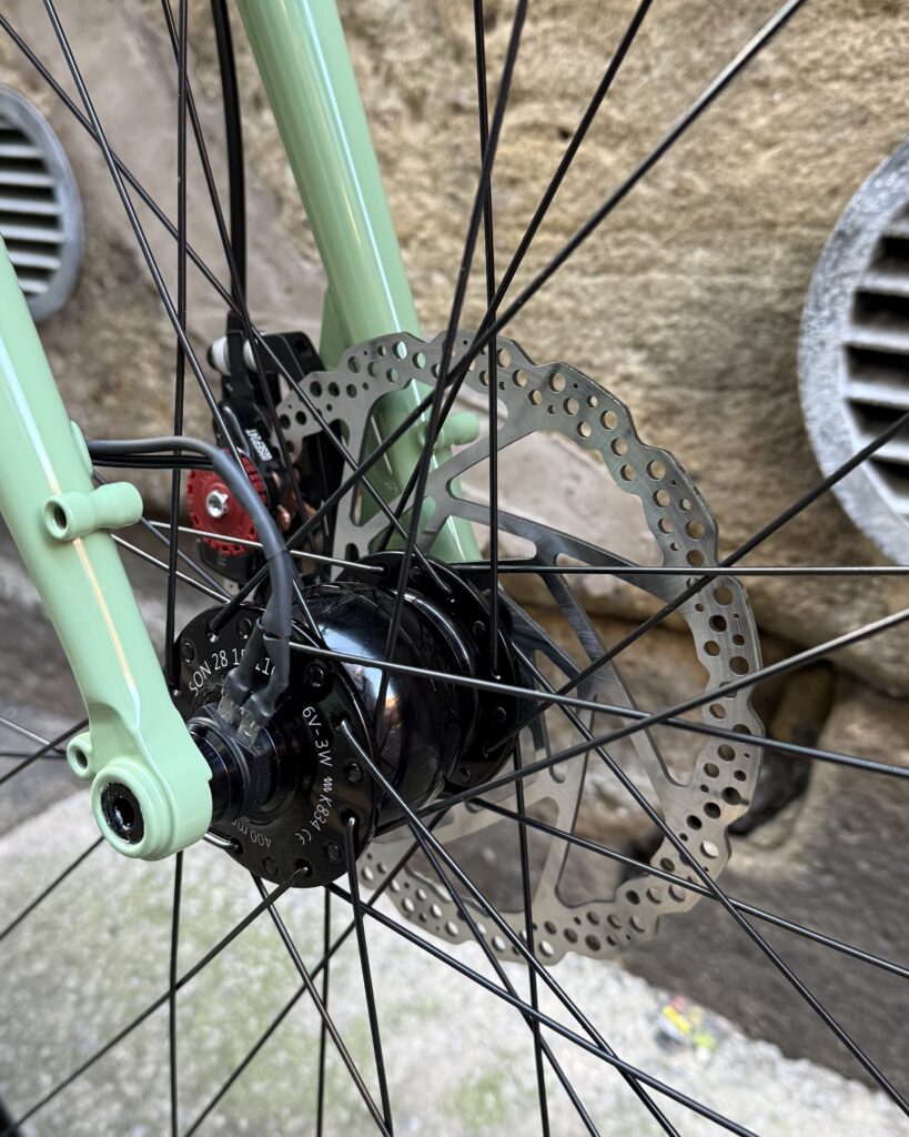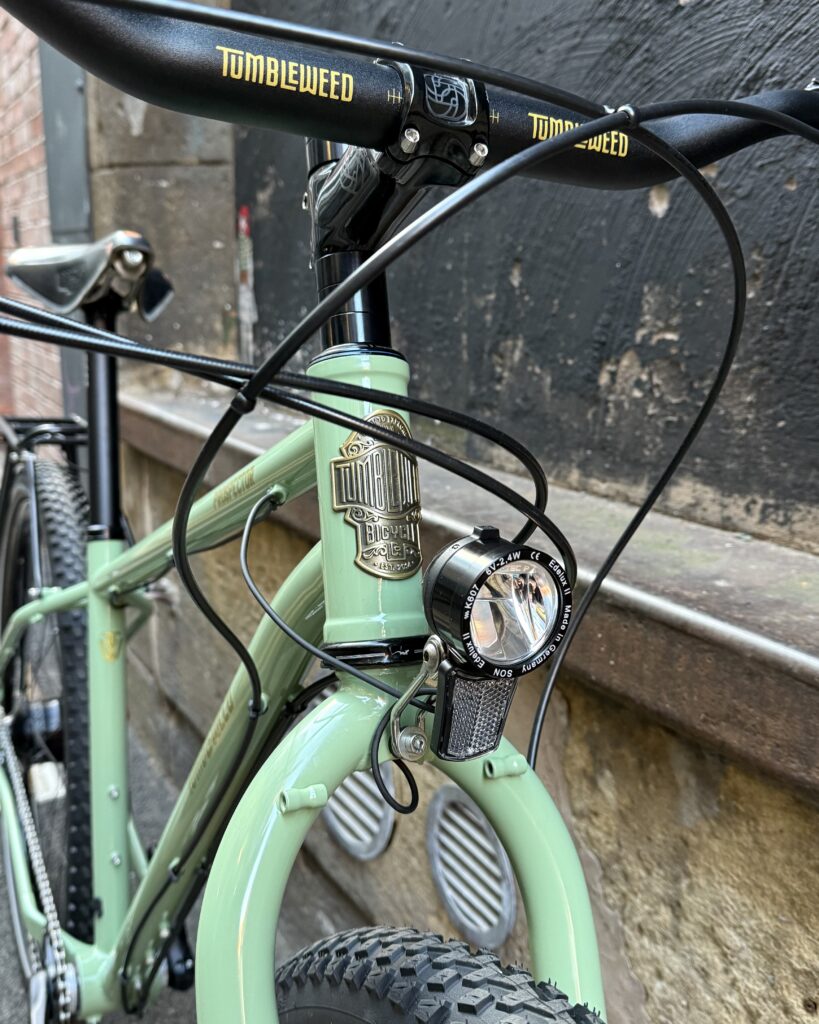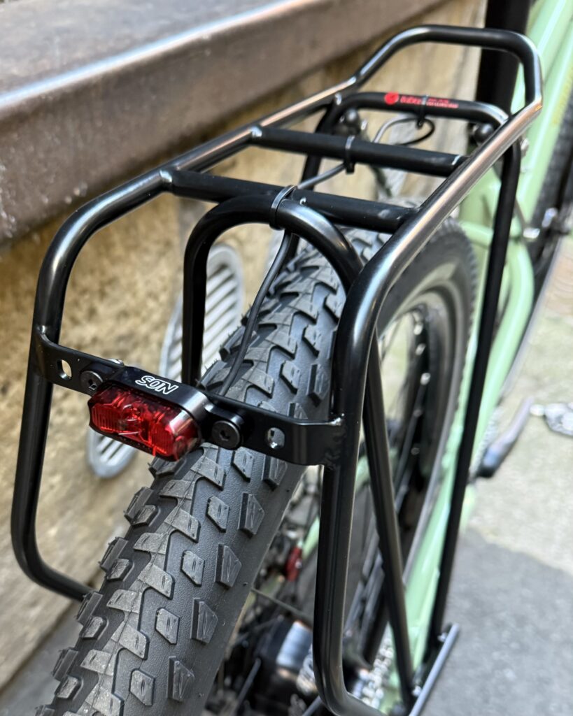 SON dynamo hub with an Edelux II Headlight and rear mounted on the Tubus Cargo rear rack. We also have a Sinewave Reactor mounted in the steerer tube to take care of charging electronics.