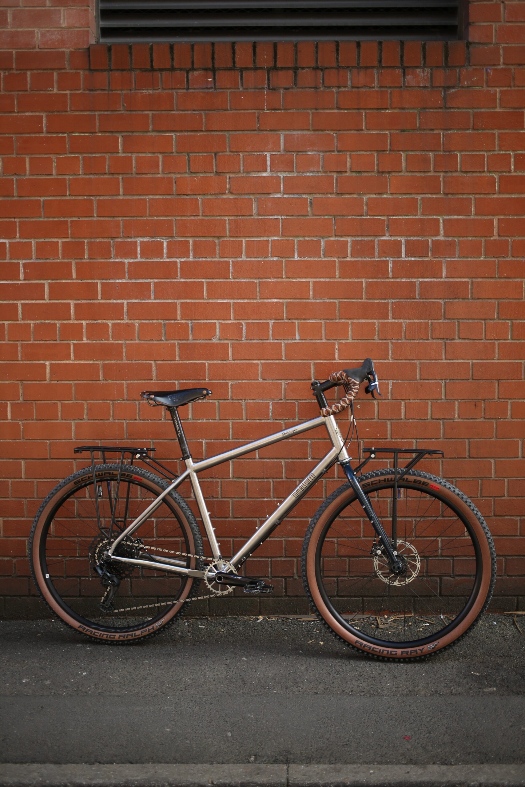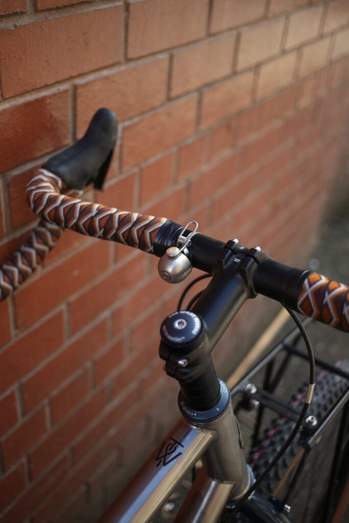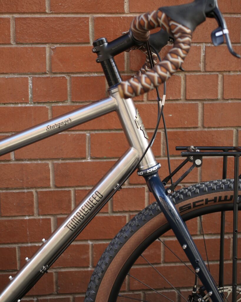Introducing this Stargazer drop bar mountain touring frame in titanium with a steel fork. It’s a super high end frame with multi-butted, cold formed oversized custom 3Al-2.5V tubing that stands up to loaded off-road riding without turning into a noodle.