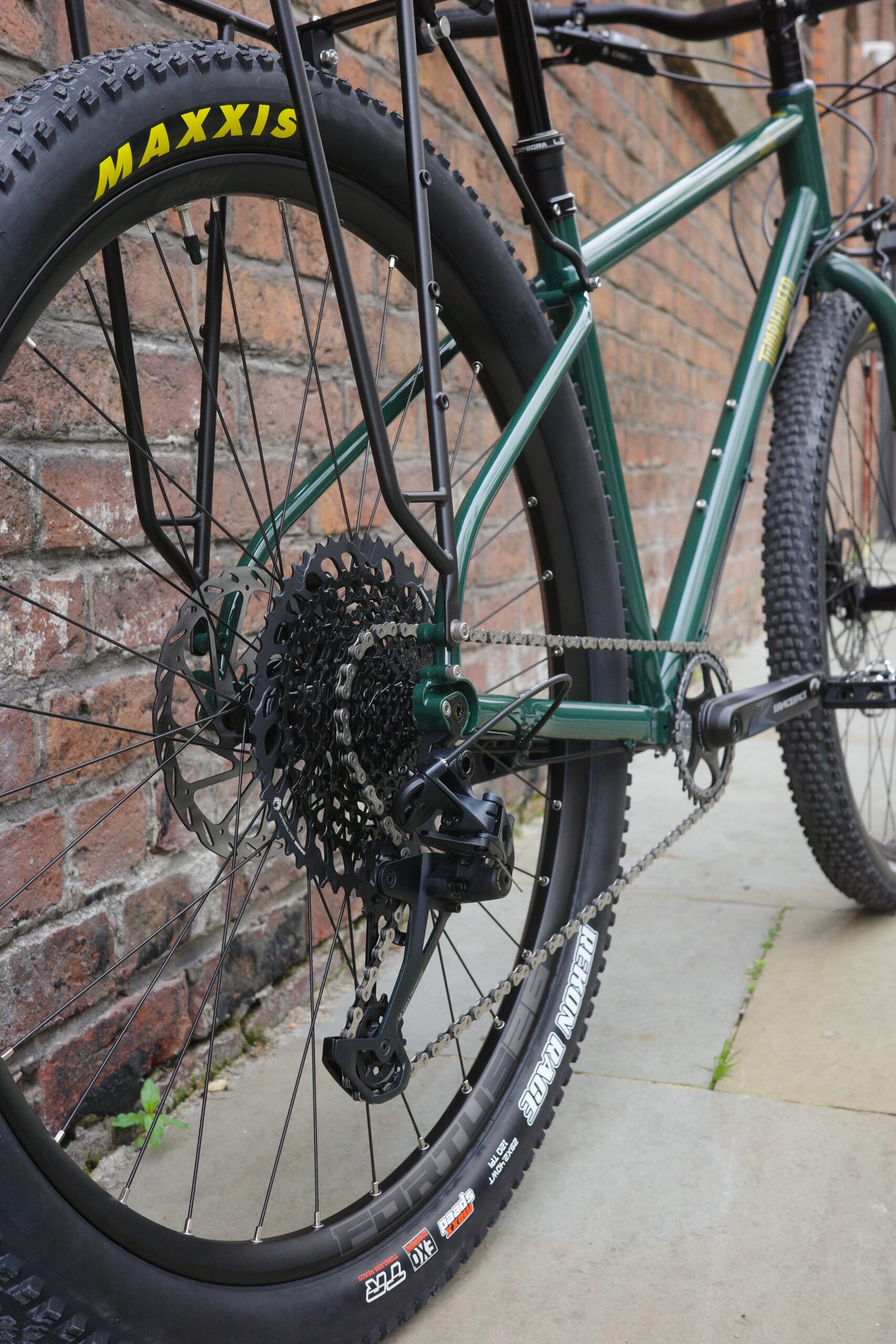 Equipped with a SRAM Eagle groupset with a wide range cassette and super reliable SRAM hydraulic brakes. Persuader bars and a Tumbleweed Mini Pannier and T racks of course!