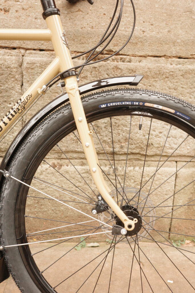 Move to 650 x 48mm tyres for more comfort and control, the difference is great. These Panaracer Gravelkings are a great all rounder, from tarmac to rough gravel they perform really well. Let some pressure out for the rough stuff.