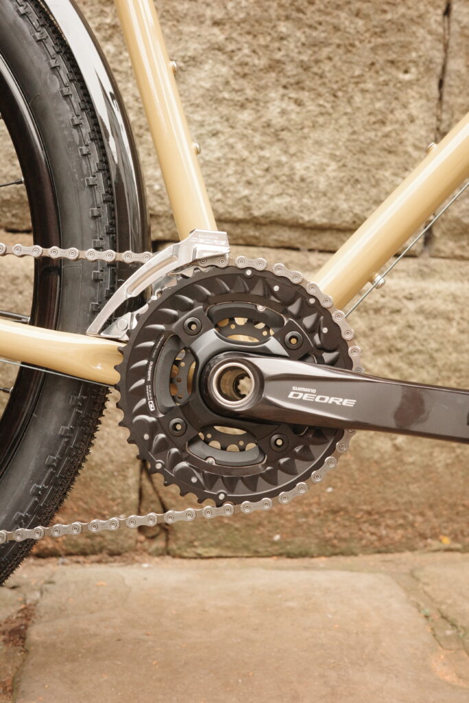 Shimano Deore triple mtb range with some nice low gears as we get older – spin to win as they say.