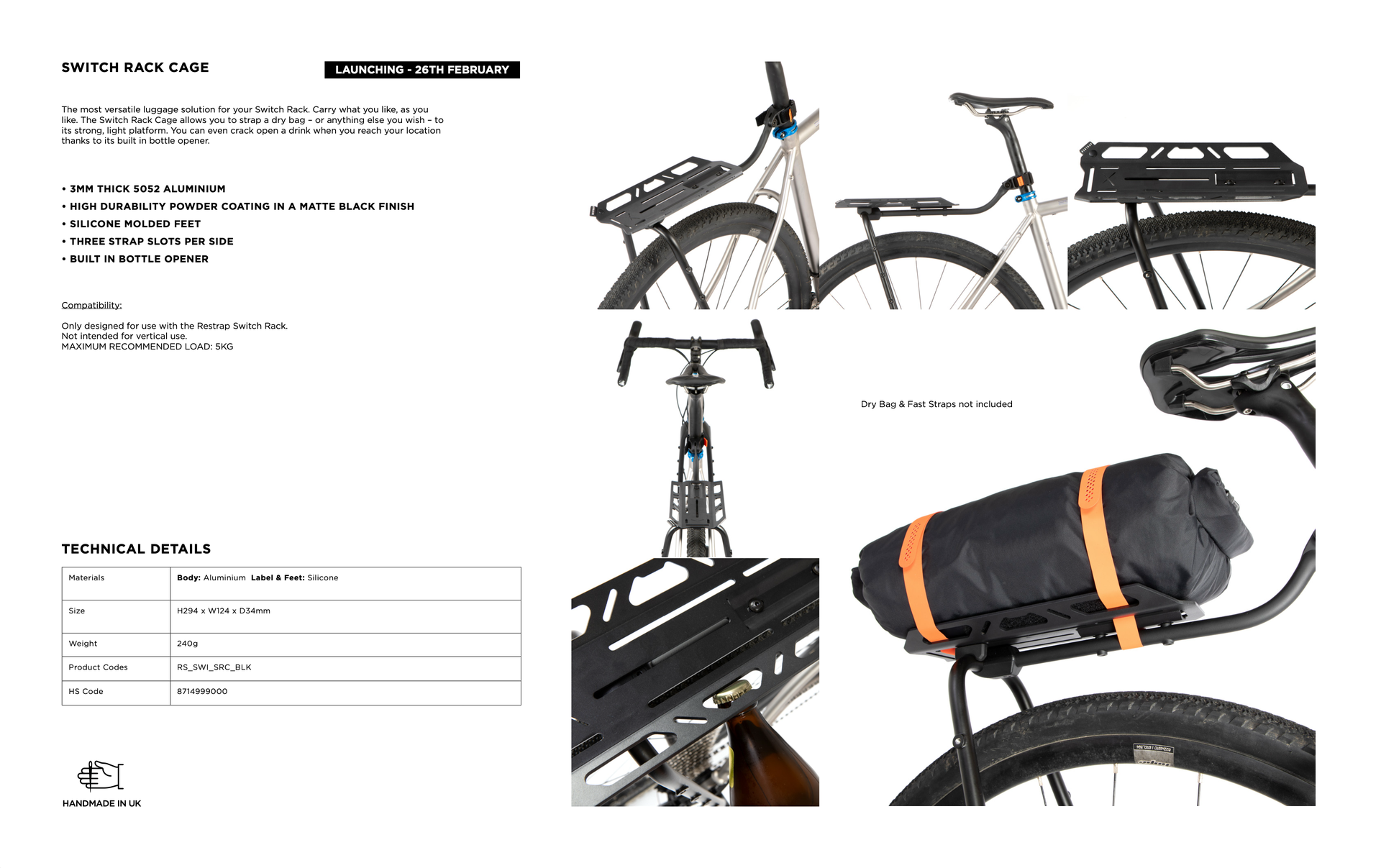 As a result, the Restrap Switch Rack Cage is probably the most versatile luggage solution for your Switch Rack. Carry what you like, as you like. Sometimes the simple solution is the most adaptable. Combine with a few fast straps and get creative with your carry.
